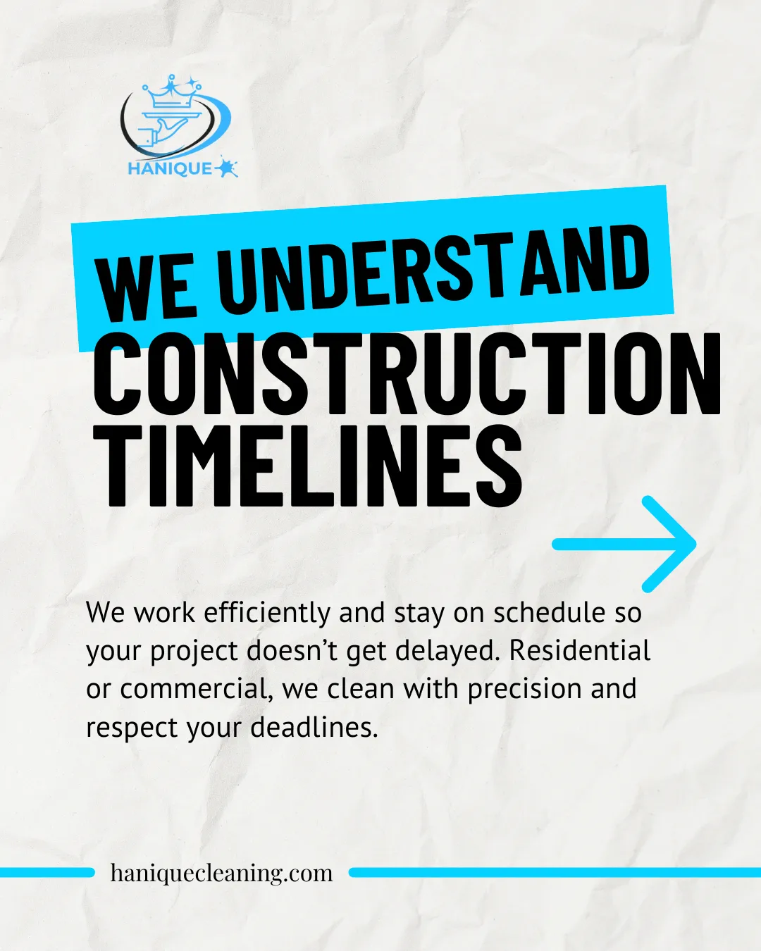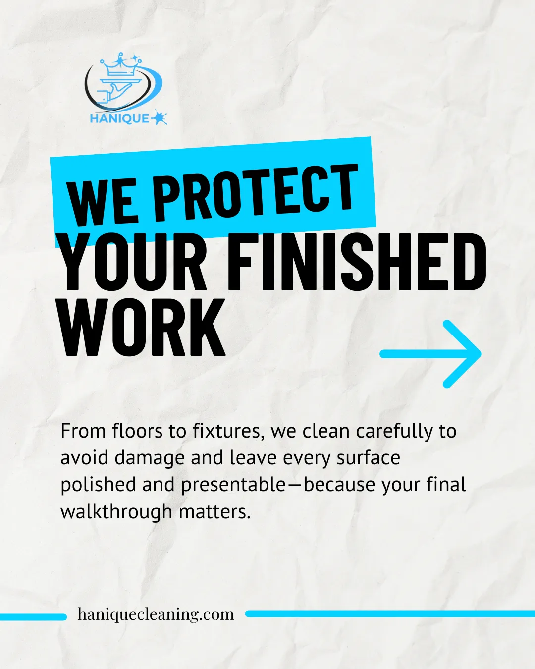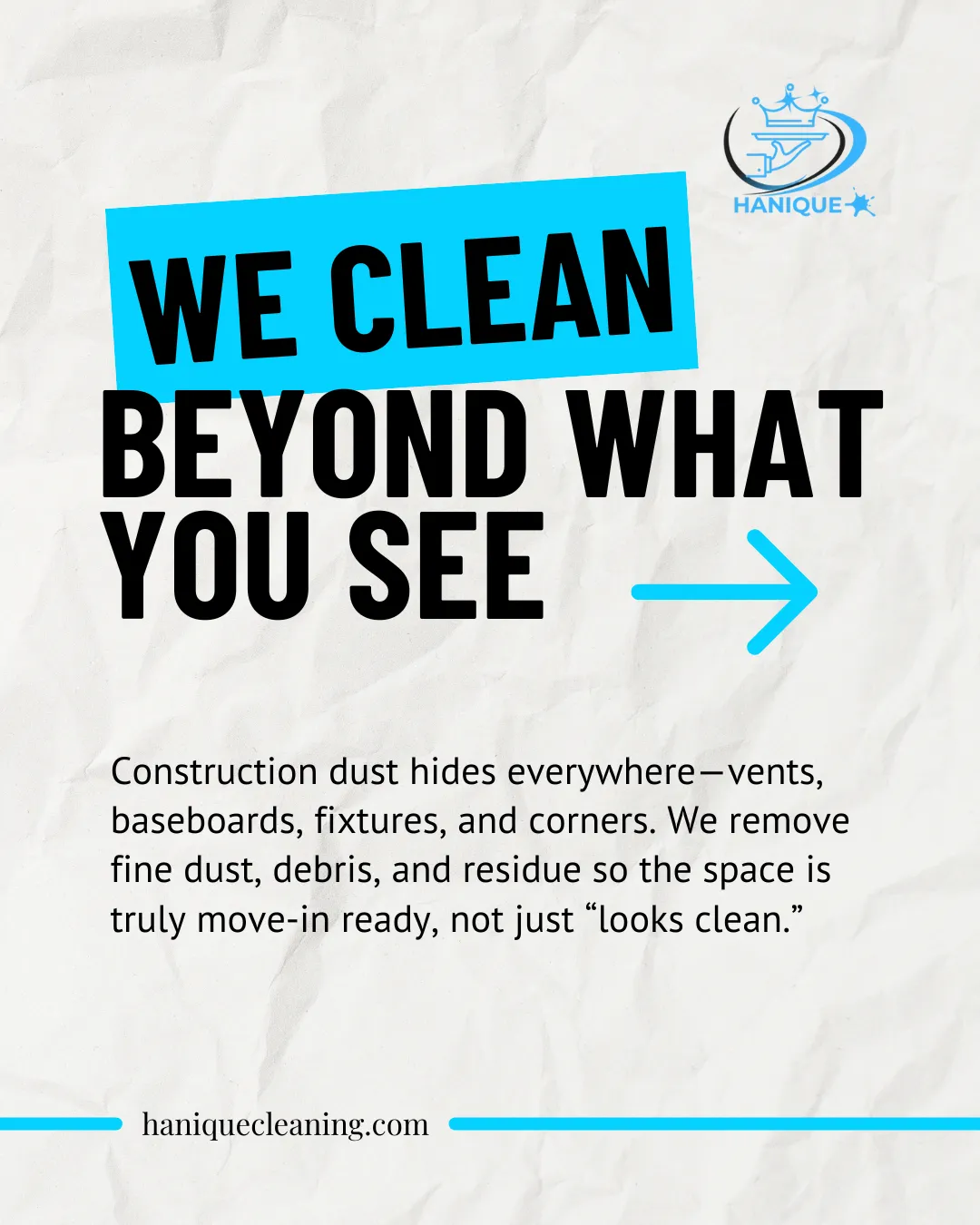 Builders and developers, your masterpiece deserves a flawless finish! At Hanique Cleaning & Company LLC, we specialize in post-construction cleaning that transforms newly built spaces into pristine, move-in-ready environments.